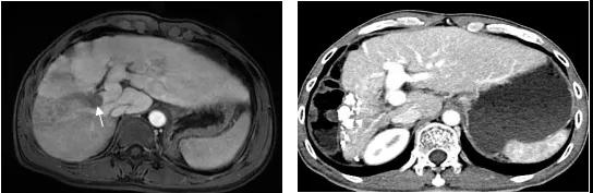 图4、该例肝右叶巨大肝癌合并门静脉右支癌栓(左图,箭头示癌栓),采用TACE治疗肝内肿瘤和放射性粒子治疗门静脉癌栓,术后19个月肝右叶肿瘤几乎完全坏死缩小,而粒子阻止了癌栓进展到主干,门静脉主干保持通畅(右图),现患者已生存5年。