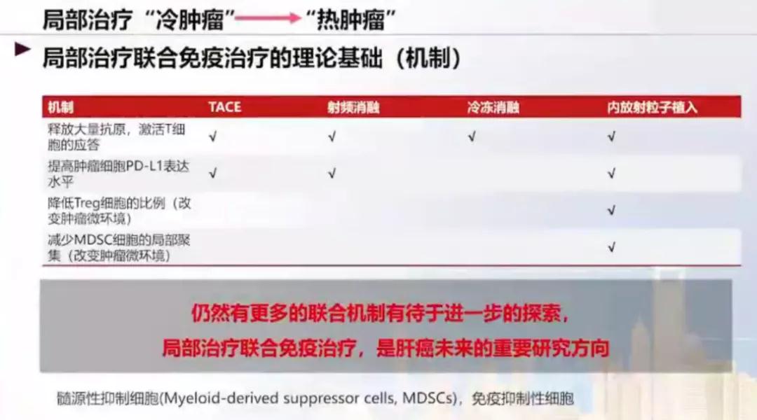 在免疫治疗方面,由于肝脏免疫耐受特性,单药免疫治疗的有效率(ORR)不足20%,生存获益也存在瓶颈。免疫联合治疗(包括靶向、介入治疗、免疫治疗、放射治疗等)已成为新的发展趋势。有越来越多的研究表明,TACE、消融、粒子植入等肝癌局部治疗可以和免疫治疗发挥协同作用,使肝癌这种免疫治疗的“冷肿瘤”转变为“热肿瘤”,进而提高疗效。