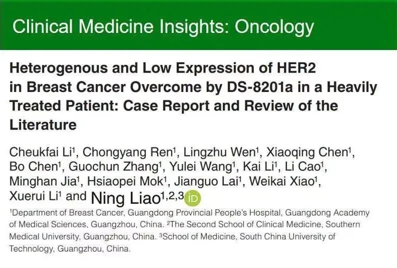 廖宁教授团队发文CLIN MED INSIGHTS杂志,HER2低表达、高异质性的MBC,应用DS-8201后获得11个月OS