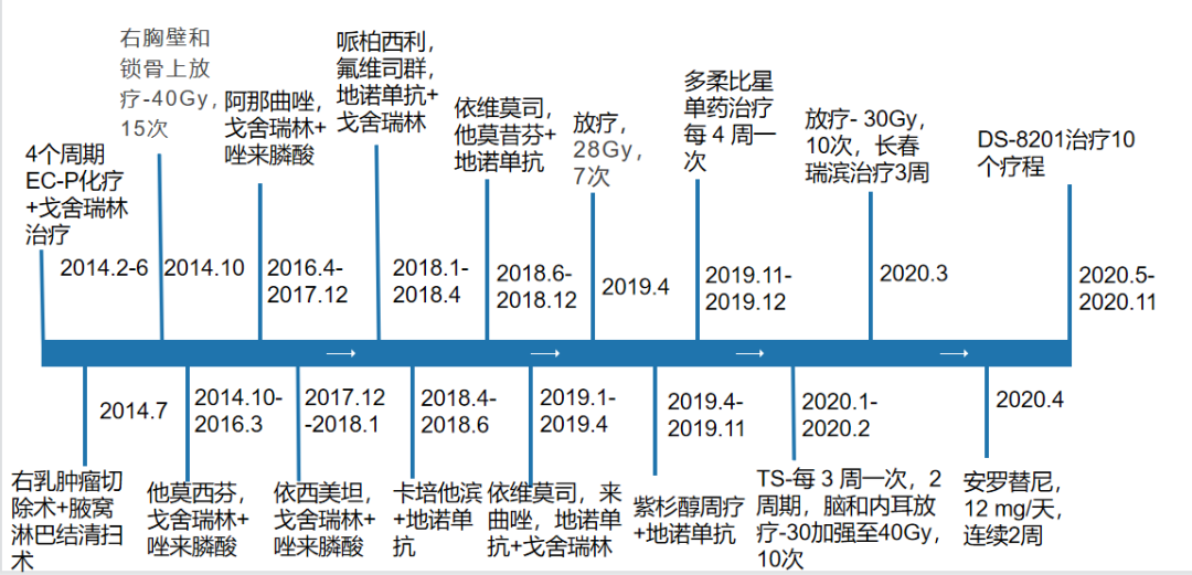 在MDT讨论下,判断患者不适合放疗(因为之前进行了全脑放疗)。因此,根据建议继续使用DS-8201以及内分泌治疗和其他对症治疗。然而,患者的情况恶化,在2020年11月19日第10个周期后停止DS-8201治疗。