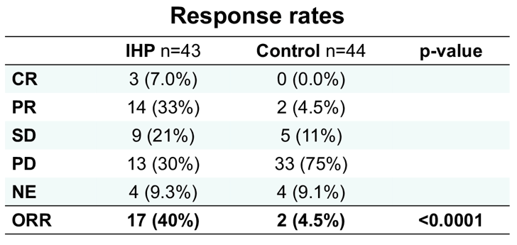 87例患者被随机分配到IHP组(43例)或对照组(44例)。在IHP组中,41例(89%)患者按照方案进行治疗,而在对照组中,49%的患者接受化疗,39%接受免疫治疗,9%接受局部治疗干预。在意向治疗人群分析中,IHP组的ORR为40%(17/43),而对照组为4.5%(2/44)(P<0.0001)。IHP组的中位hPFS为9.1个月,而对照组为3.3个月(P<0.0001)。IHP组的中位PFS为7.4个月,而对照组为3.3个月(P<0.0001)。IHP组有14例与治疗相关的严重不良事件,其中血管并发症和感染是最常见的副作用,而对照组有13例与免疫治疗相关的副作用最常见。IHP组有1例治疗相关死亡。研究结果提示,初治眼葡萄膜黑色素瘤仅肝转移患者中,与最佳替代治疗相比,IHP治疗可获得更好的ORR、hPFS和PFS。