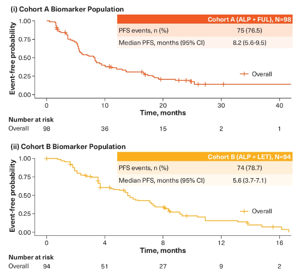 结果:队列A和队列B分别纳入127名和126名患者,根据ctDNA样本的可用性、既往CDK4/6抑制剂治疗时间的数据以及中心确定的PIK3CA突变状态,队列A和B分别有98名(≤6个月:24名;>6个月:74名)和94名(≤6个月:28;>6个月:66)患者纳入本分析。在这部分纳入分析的人群中,队列A和队列B的mPFS分别为8.2个月(95%CI:5.6-9.5)和5.6个月(95%CI:3.7~7.1)。