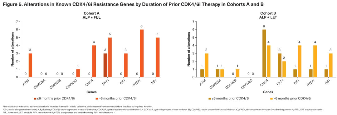 结论:队列A中,与CDK4/6抑制剂治疗时间>6个月组相比,≤6个月组的患者观察到较低的中位ctDNA分数和较低的突变复杂性,mPFS更长,这可能表明ALP对PI3K-α突变的依赖性增加。在队列B中,≤6个月组和>6个月组的中位ctDNA分数均较高,肿瘤基因突变谱相似。需要更多的ctDNA和组织分析来阐明ALP联合内分泌治疗的疗效与治疗时间和基线基因组复杂性之间的相关性。