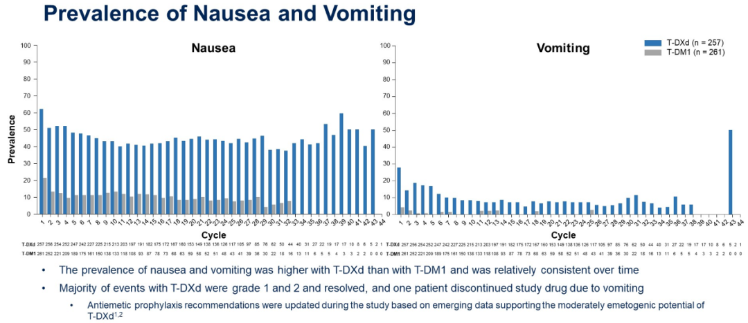 T-DXd组每个治疗周期的恶心、呕吐、脱发患病率高于T-DM1组,且这种差异在治疗全程中保持一致。大部分为1/2级事件且得到解决,仅有1例患者因呕吐而停药。T-DXd组和T-DM1组的乏力患病率相似,治疗过程中基本保持一致。