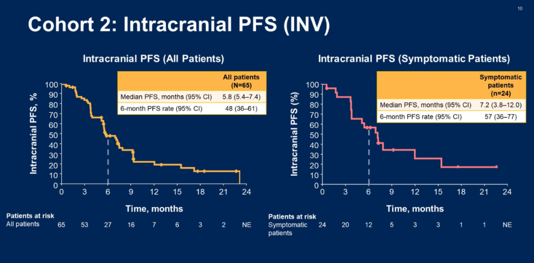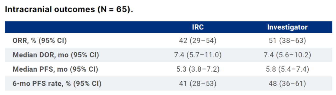 结果:共入组65名患者(中位年龄55岁;63%为男性)。基线时,37%的患者服用激素和/或有症状;49%乳酸脱氢酶升高。所有患者的中位随访时间为9.7个月,激素和/或有症状患者的中位随访时间为10.0个月(n=24),无症状患者的中位随访时间为9.7个月(n=41)。IRC和研究者评估的颅内ORR分别为42%和51%(BOR一致性:68%)。下表中列出了颅内DOR和PFS。经研究者评估在基线检查时使用激素和/或有症状的患者中,ORR为58%,DOR为10.2个月,PFS为7.2个月;在无症状患者中,ORR为46%,DOR为5.7个月,PFS为5.5个月。