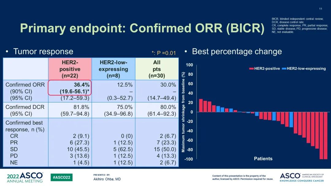 22例HER2阳性患者既往接受中位2线治疗(范围1-4),45.5% IHC3+、54.5% IHC2+/ISH+,BICR ORR为36.4%(8/22;2例CR,6例PR;90%CI,19.6~56.1),在统计学上有显著改善P=0.01);DCR 81.%(95%CI,59.7~94.8);中位疾病持续缓解时间(mDOR)7.4个月(95%CI 2.8~NA);mPFS 5.1个月(95%CI,3.0~7.3);mOS 7.1个月(95%CI,4.7~14.6)。在8例HER2低表达患者中也能看到令人鼓舞的疗效,BICR ORR为12.5%(1/8;1例PR;95%CI,0.3~52.7),DCR 75.0%(95%CI,34.9–96.8),mPFS 3.5个月(95%CI,1.2~5.5),mOS 8.9个月(95%CI,3.0~12.8)。在安全分析中,≥3级TEAE的发生率为81.3%(26/32):常见的是贫血(53.1%)、中性粒细胞减少(31.3%)和白细胞减少(31.3%),8例(25.0%)因TEAE导致停药,8例患者(25.0%)存在间质性肺疾病(IDL),但未经BICR确定。