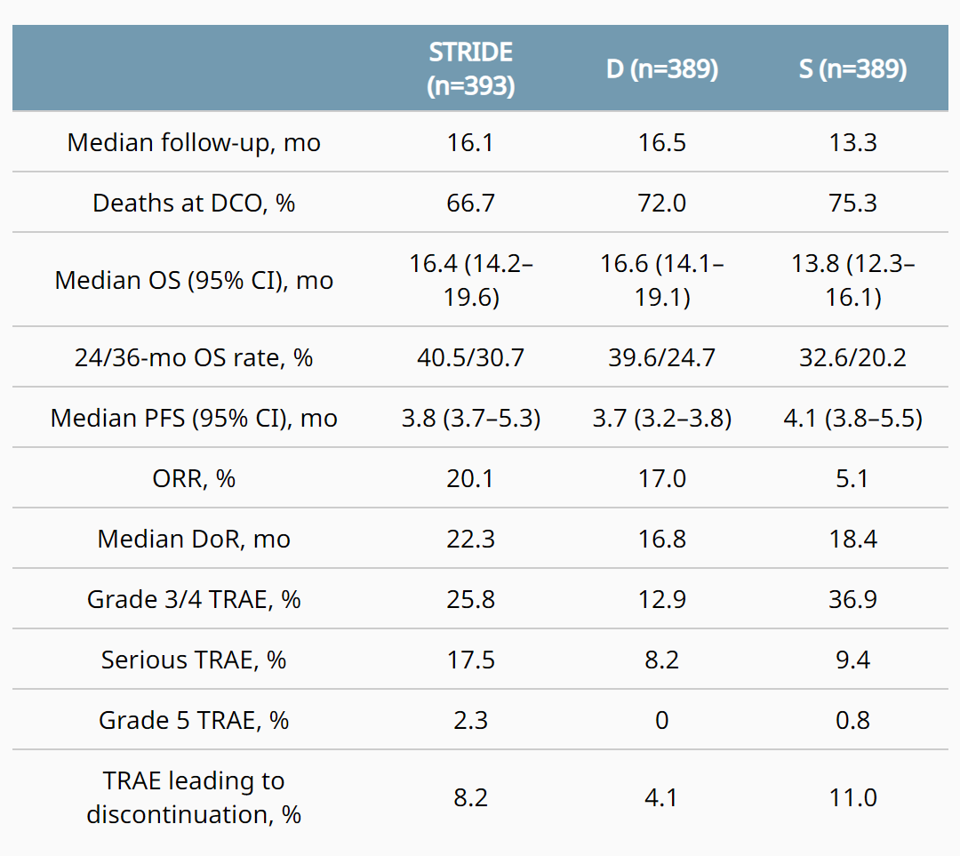 在所有治疗组中,基线PROs评分均>77%,总体评分>70%。各治疗组的基线得分具有可比性。与S组患者相比,STRIDE和D组患者在疲劳、食欲减退、腹痛、PF、生理职能(RF)和GHS/QoL的TTD显著延长;STRIDE组较S组的在恶心、腹部肿胀TTD明显延长