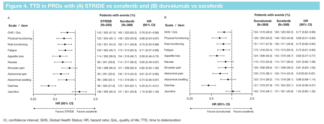 HIMALAYA研究预先设置的次要终点是评估STERIDE方案(N=393)、D方案(N=389)及S方案与S方案(N=389)的PRO。通过欧洲癌症治疗研究组织30项生活质量评分问卷(EORTC QLQ-C30)问卷和EORTC 18项HCC QoL评分问卷(EORTC QLQ-HCC18)评估患者的疾病相关症状、身体功能(PF)和整体生存状况/生活质量(GHS/QoL)。对基线症状评分≤90、PF和GHS/QoL评分≥10患者进行到疾病恶化时间(TTD)评估,TTD定义为从随机化到后续随访或死亡中确认的首次临床意义恶化(恶化≥10分)的时间。
