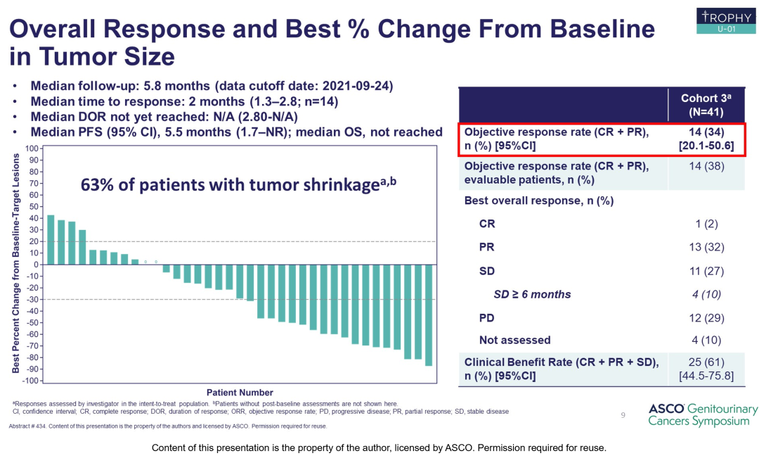 [9]Grivas P, Pouessel D, Park C H, et al. TROPHY-U-01 Cohort 3: Sacituzumab govitecan (SG) in combination with pembrolizumab (Pembro) in patients (pts) with metastatic urothelial cancer (mUC) who progressed after platinum (PLT)-based regimens[J]. J Clin Oncol, 2022, 40(6_suppl): 434-434.