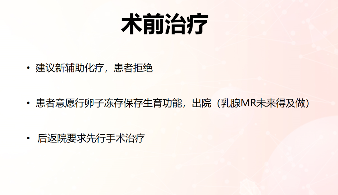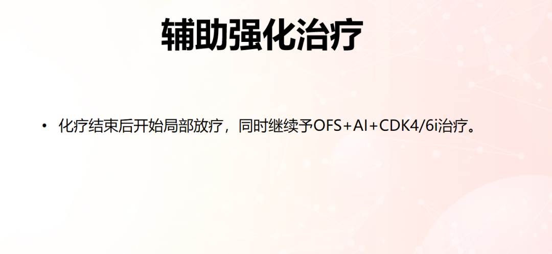 裴静教授:我认为该患者如果能在进行良好的沟通后接受新辅助治疗是更好的,因为该患者有14枚淋巴结转移(N3),术后需要进行放疗,放疗后如果进行假体植入,在包膜挛缩和乳腺外形方面都值得推敲。该患者淋巴结转移数量较多,因此进行强化治疗是非常重要的。由于该病例中患者为年轻女性,根据SOFT&TEXT研究,使用OFS联合AI是一个标准的治疗方案。另一方面,由于该患者淋巴结转移数大于4枚,根据Monarch E研究提示,加上CDK4/6抑制剂进行强化治疗是非常合适的。