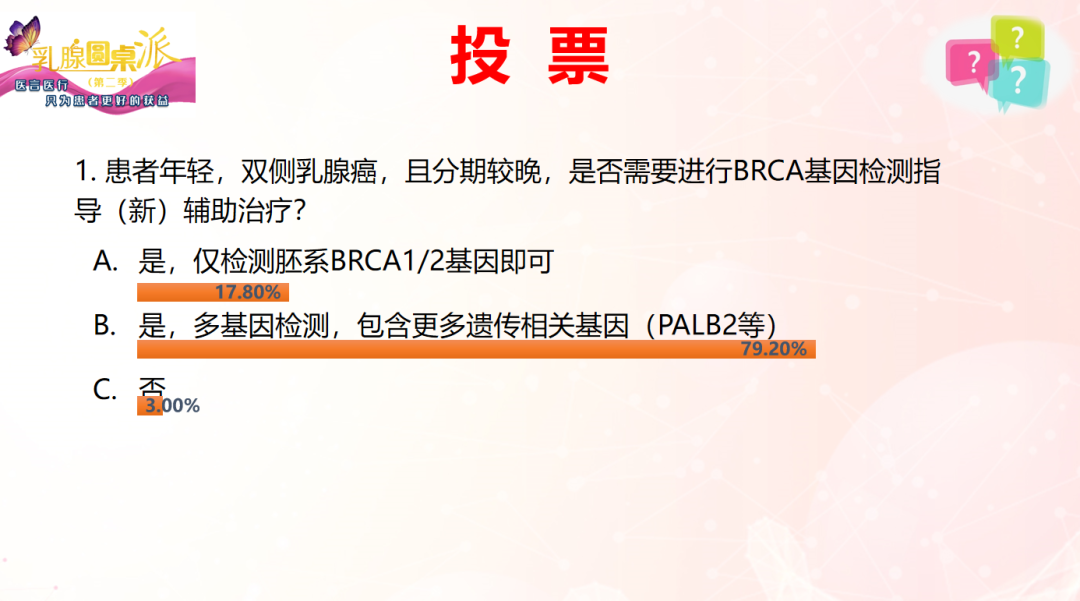 网上医生投票结果揭晓:绝大多数网上医生投票支持多基因检测,包含更多遗传相关基因(PALB2)。