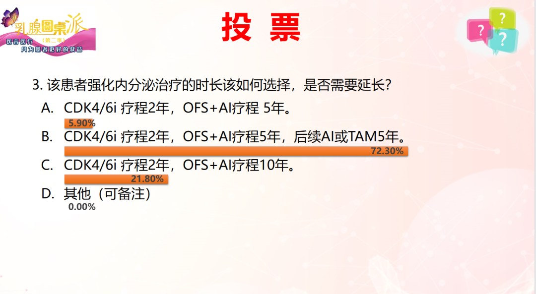 网上医生投票结果揭晓:72.3%的医生投票支持后续使用AI或者TAM治疗5年,21.8%选择后续应用OFS联合AI治疗10年。