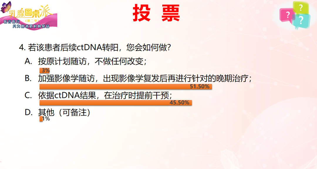网上医生投票结果揭晓:51.5%的医生投票支持ctDNA检测转移后应加强影像学随访,出现影像学复发后再进行针对性的晚期治疗,45.5%的医生支持治疗时提前干预。