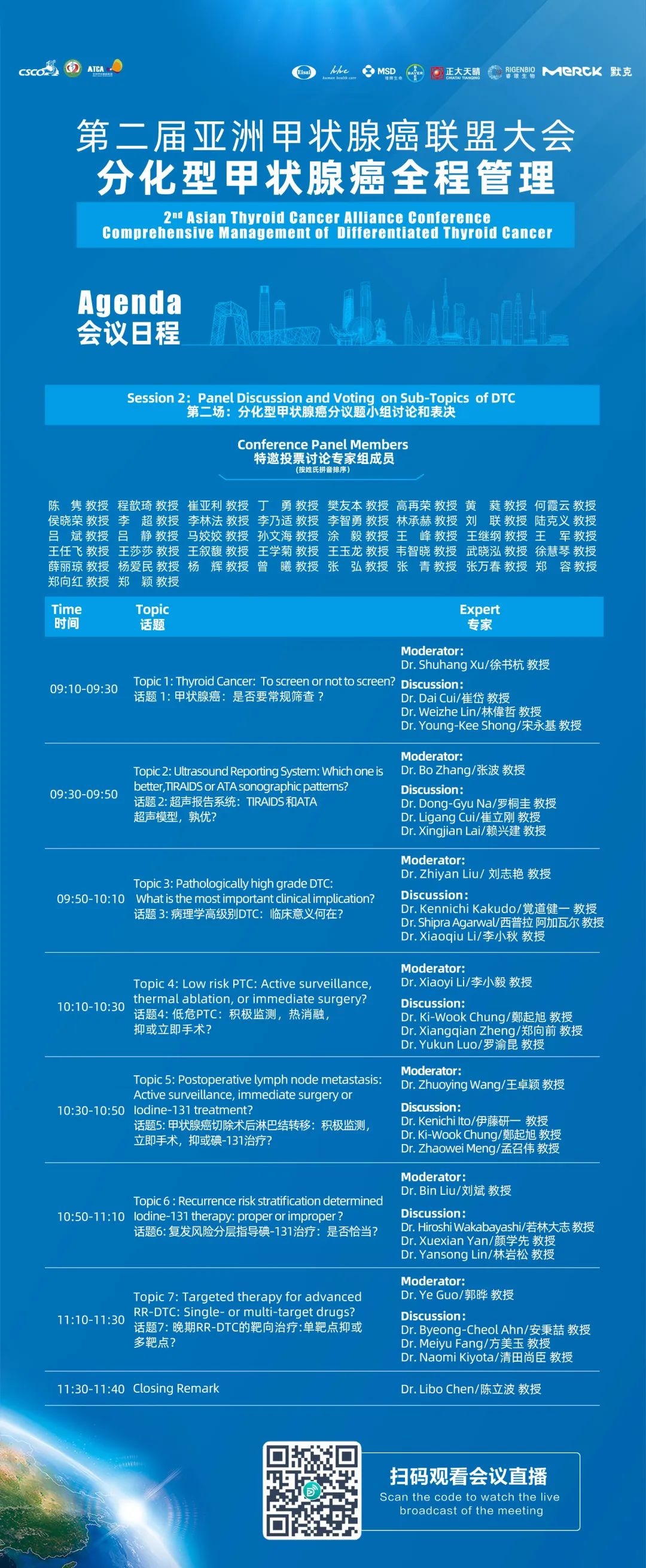主题发言环节中,陈立波教授、伊藤研一教授(Dr. Kenichi Ito, 日本信州大学医院)与安秉喆教授将分别分享中、日、韩分化型甲状腺癌的管理概览。在此基础上,与会专家将对分化型甲状腺癌筛查、超声检查、病理诊断、低危甲状腺乳头状癌管理、术后淋巴结转移管理、碘-131治疗决策、靶向治疗等问题进行实时投票和深入讨论,引导学术及精准治疗方向。