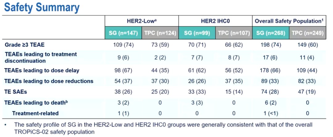 SG在HER2-low和HER2 IHC0患者中的安全性是可控的,亚组的安全状况与总体人群一致。