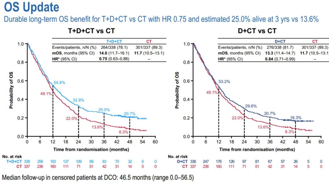 2022 ESMO报告了中位随访46.5个月(范围0.0-56.5)的分析结果,与单独化疗相比,接受T+D+CT方案的患者维持OS获益,中位OS分别为14.0个月和11.7个月(风险比<hr/>=0.75 95%置信区间[CI]:0.63-0.88),3年内存活的患者分别占25%和13.6%。