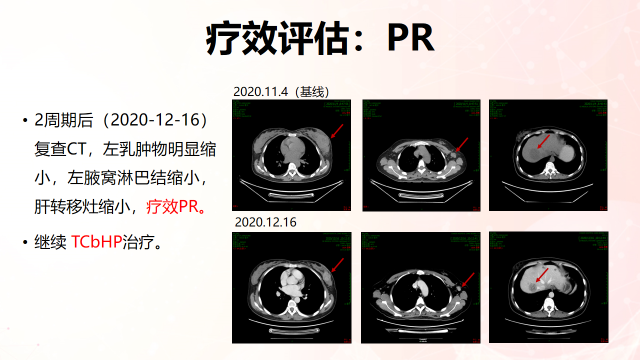 殷咏梅教授:是的,假如异质性比较强,可以更加理解一线mPFS这么短,但是该患者ER、PR均为阴性且HER2(3+),从TCbHP方案获益PFS仅仅只有4个月,是有一些不符合常理的,所以还是建议复核患者的HER2状态,进行病理上的确认。