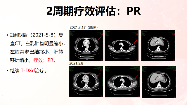 王殊教授:这是一个开放性问题,目前没有标准答案。患者之前的治疗都是用的大分子药物,无论是ADC药物,还是曲帕双靶联合化疗,所以如果没有其他靶点,还要继续在抗HER2的道路上走下去的话,我会加上TKI药物。当然如果有其他新型的ADC药物或新的靶点药物可供选择的情况下,那将是一个更精准的指引,在当前没有新的ADC和靶点的情况下,我会把TKI加上。
