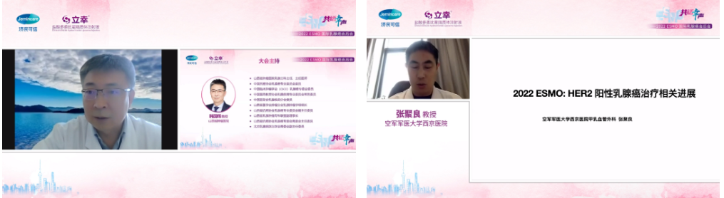 在山西省肿瘤医院韩国晖教授主持下,空军军医大学西京医院张聚良教授报告了2022年ESMO大会HER2+乳腺癌靶向治疗及相关转化研究进展。