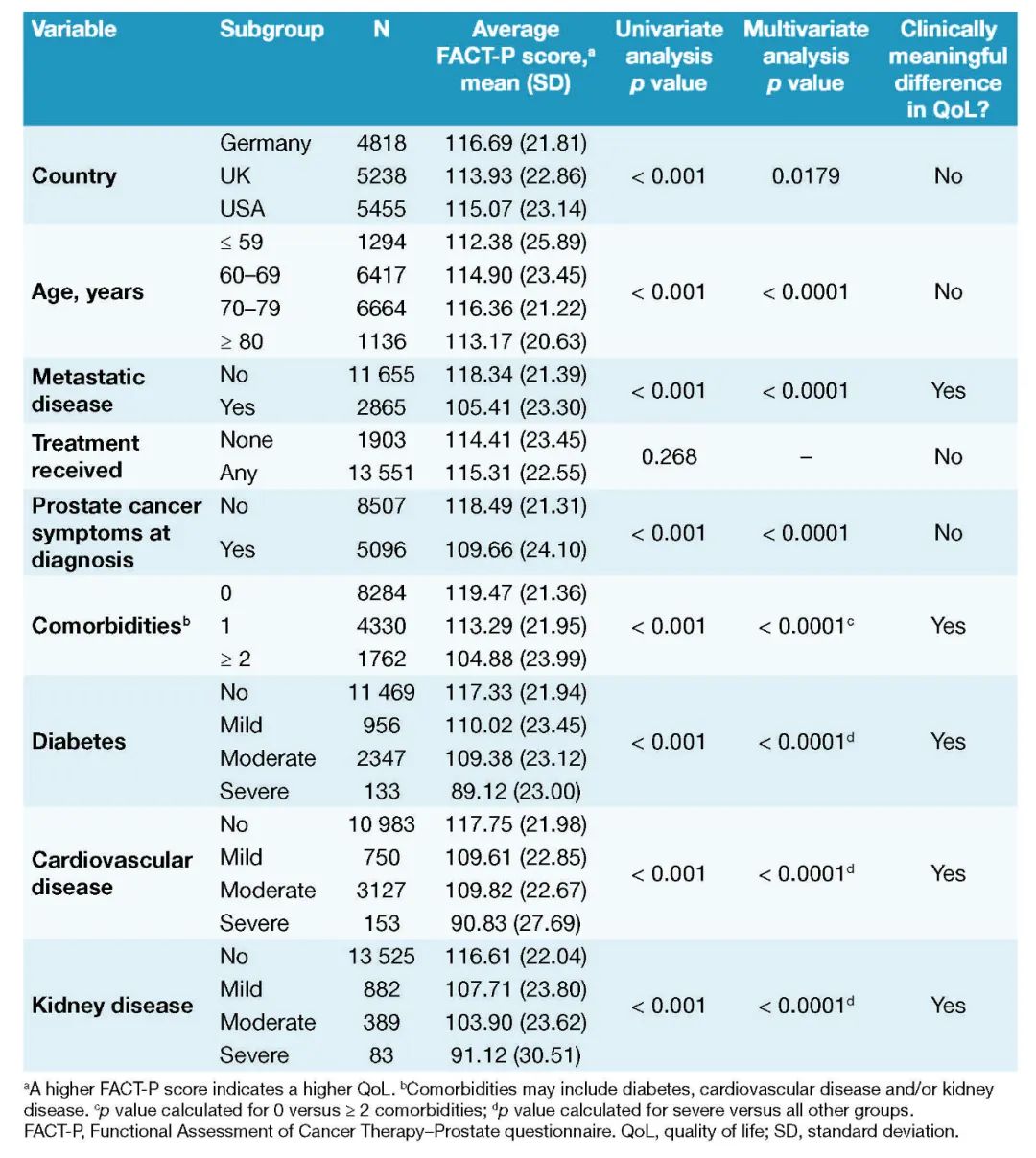 前列腺癌患者的生活质量(QoL)结局可因疾病情况、接受的治疗和国家/医疗体系的不同而异。