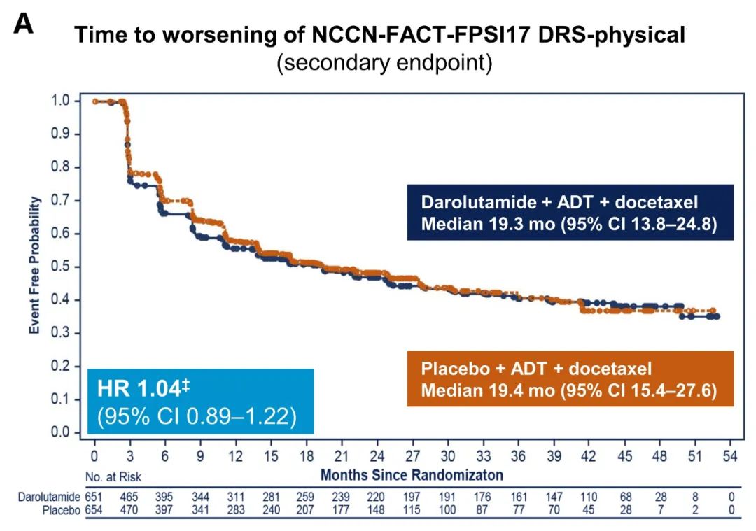 与安慰剂+ADT+多西他赛相比,达罗他胺+ADT+多西他赛早期强化治疗改善了患者相关终点,减少了全因和前列腺癌相关死亡,大多数特别关注的不良事件的发生率和时间进程相似,特别是心脏疾病发生率未增加。随着时间推移,QoL保持不变,达罗他胺对QoL无不良影响,包括预后不佳的患者在内。