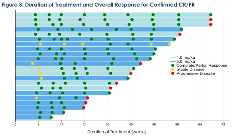 基线特征:研究入组了59例患者(4mg/kg组23例,5mg/kg组36例),88%的患者接受过针对转移性疾病的3种及以上方案治疗,40.7%的患者接受过针对转移性疾病的5种及以上方案治疗,28.8%的患者接受过抗PD-1/L1治疗。57例患者可进行TROP2检测,其中54.2%为TROP2高表达(定义为H评分>200~300)。