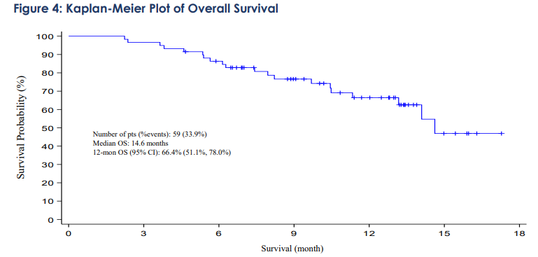 疗效:在55例可进行疗效评估的患者(4mg/kg组21例,5mg/kg组34例)中,确认的客观缓解率(ORR)为40%,疾病控制率(DCR)为80%,其中TROP2高表达患者确认的ORR为55.2%,TROP2高表达5mg/kg剂量组确认的ORR高达62.5%。中位持续缓解时间(DoR)为11.5个月,中位无进展生存期(mPFS)为5.7个月,中位总生存期(mOS)为14.6个月,12个月OS率为66.4%。