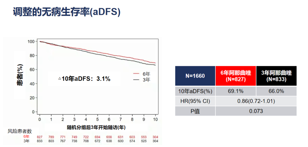 延长内分泌治疗也是大家比较关注的方案。到底哪些患者需要延长内分泌治疗?2022年DATA研究报告了最终分析结果。研究对象为HR+绝经后早期乳腺癌,患者已经接受2~3年的他莫昔芬辅助治疗。如果没有复发转移,则按照1:1的比例随机分至进行3年或者6年阿那曲唑治疗。阿那曲唑治疗6年组与3年组的校正10年DFS率分别为69.1%和66.0%,P=0.073。亚组分析显示,ER、PR双阳性患者阿那曲唑治疗6年的DFS率较高,6年组和3年组分别为70.8%和64.4%,P=0.008。
