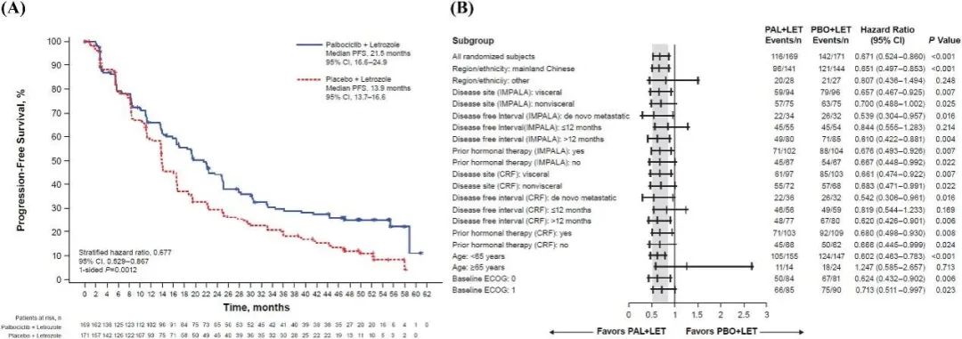 哌柏西利的第二项重要研究为全球性、多中心的PALOMA-2临床研究,本研究证实了相较于安慰剂联合来曲唑,哌柏西利联合来曲唑一线治疗HR+/HER2-晚期乳腺癌患者能够显著改善PFS,前期分析显示中位PFS分别为24.8个月和14.5个月。2022年ASCO会议报告了OS最终结果,哌柏西利联合来曲唑组的中位OS为53.9个月,对照组为51.2个月,P=0.3378,未达到统计学意义。所以PALOMA-2研究达到了改善PFS的主要研究终点,但没有达到改善OS的次要终点。