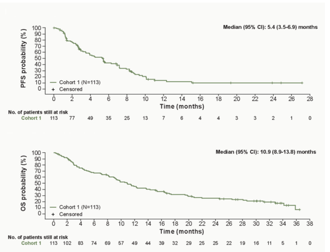 本次ASCO-GU会议更新了TROPHY-U-01队列1随访至2022年7月26日的研究数据。接受治疗的患者(n=113)中位随访时间为10.5个月(范围:0.3~40.9)。患者(78%为男性;中位年龄66岁;66%有内脏转移,34%为肝转移)既往接受过多线治疗,中位既往治疗线数为3(范围:1~8)。距前序末次治疗时间为1.5个月(范围:0~60.0)。