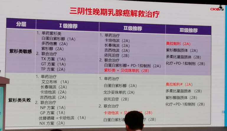 2023版CSCO BC指南三阴性晚期乳腺癌解救治疗的更新不多,主要是优替德隆+卡培他滨的证据级别调整。虽然化疗仍是三阴性晚期乳腺癌最常用的基本治疗手段;但一些靶向治疗药物对于部分具有特定靶点的三阴性晚期乳腺癌患者取得了精准突破;免疫治疗已经进入三阴性晚期乳腺癌的临床实践,PD-L1阳性的一线治疗患者是其优选人群;ADC类药物已进入三阴性晚期乳腺癌的临床实践且具有值得期待的广阔应用前景。
