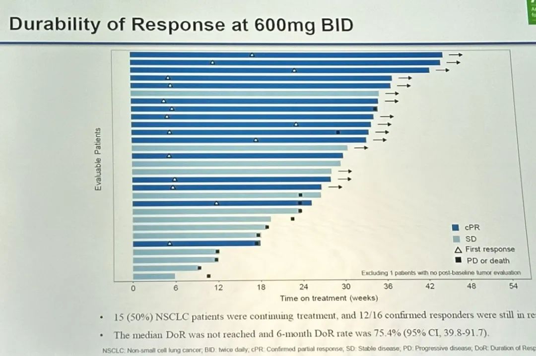 本研究未达到中位缓解持续时间(DOR),但600 mg组的6个月DOR率为75.4%(95%CI:39.8~91.7%)。