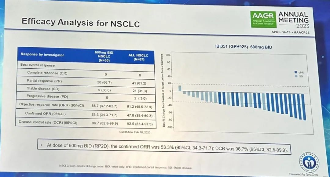 2023年美国癌症研究协会(AACR)年会于2023年4月14日至19日在美国奥兰多举行,多项重要的基础和临床研究结果在会议上展示,包括来自中国的IBI351单药治疗晚期实体瘤患者的I期研究的最新结果。根据这项I期剂量递增研究(NCT05005234)的最新数据[1],II期推荐剂量IBI351单药治疗晚期KRAS G12C突变非小细胞肺癌(NSCLC)患者具有良好的安全性和令人鼓舞的疗效。
