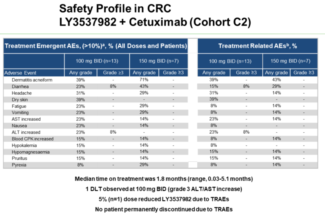 LY3537982联合西妥昔单抗:LY3537982剂量为100 mg或150 mg,100 mg剂量组有1例DLT事件为3级丙氨酸转氨酶(ALT)/天冬氨酸转氨酶(AST)升高,1例患者报告因TEAE减量。在100 mg和150 mg剂量组,最常见任何级别TEAE分别是痤疮样皮炎(39%和71%)、腹泻(23%和43%)、头痛(31%和29%)、皮肤干燥(39%和不适用[NA])、疲劳(23%和29%)、呕吐(23%和29%)、AST升高(23%和14%)、恶心(23%和14%)、ALT升高(23%和NA)、血肌酸磷酸激酶增加(15%和14%)、低钾血症(15%和14%)、低镁血症(15%和14%)、瘙痒(15%和14%)和发热(8%和29%)。≥3级TEAE包括100 mg剂量组的腹泻(8%)和ALT升高(8%);任何级别TRAE为痤疮样皮炎(39%和43%)、腹泻(15%和29%)、头痛(31%和14%)、皮肤干燥(39%和NA)、疲劳(8%和14%)、呕吐(8%和14%)、AST升高(23%和14%)、恶心(8%和NA)、ALT升高(23%和NA)、血肌酸磷酸激酶升高(8%和14%)、低钾血症(8%和NA)、低镁血症(15%和14%)、瘙痒(15%和14%)和发热(8%和14%)。≥3级TRAE包括100 mg剂量组的腹泻(8%)和ALT升高(8%)。