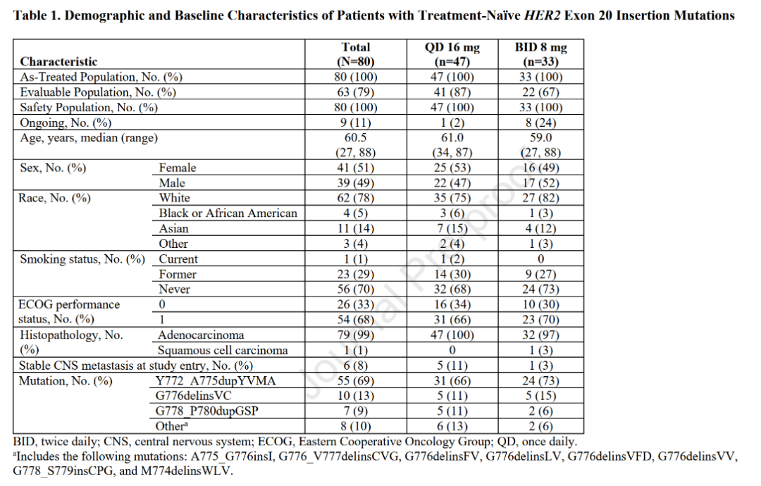 一般特点:最终,从2018年8月至2021年12月,共计80例患者入组,每日一次和每日两次组分别入组47例和33例患者,9例患者在数据分析时仍然接受研究药物治疗,全组患者中位年龄60.5岁,51%的患者为女性,68%的患者PS评分0-1分,99%的患者病理类型为腺癌。