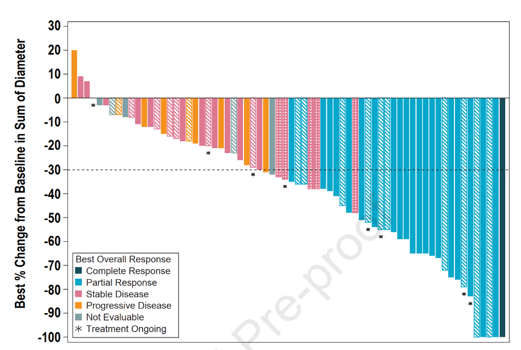 疗效:在全分析人群中,独立评审委员会评估的ORR为39%,包括1%的CR和38%的PR,另有34%的患者评估为SD,DCR为73%,80%的患者瘤体出现不同程度缩小,另有16%的患者在首次疗效评估前脱落,中位随访时间7.6个月,中位至响应出现时间为29天,中位DOR和中位PFS分别为5.7个月和5.6个月。在每日一次和每日两次组,ORR分别为45%和30%,DCR分别为75%和70%。中位PFS均为5.6个月,中位DOR分别为5.7个月和未达到(随访时间较短,中位随访时间3.7个月)。