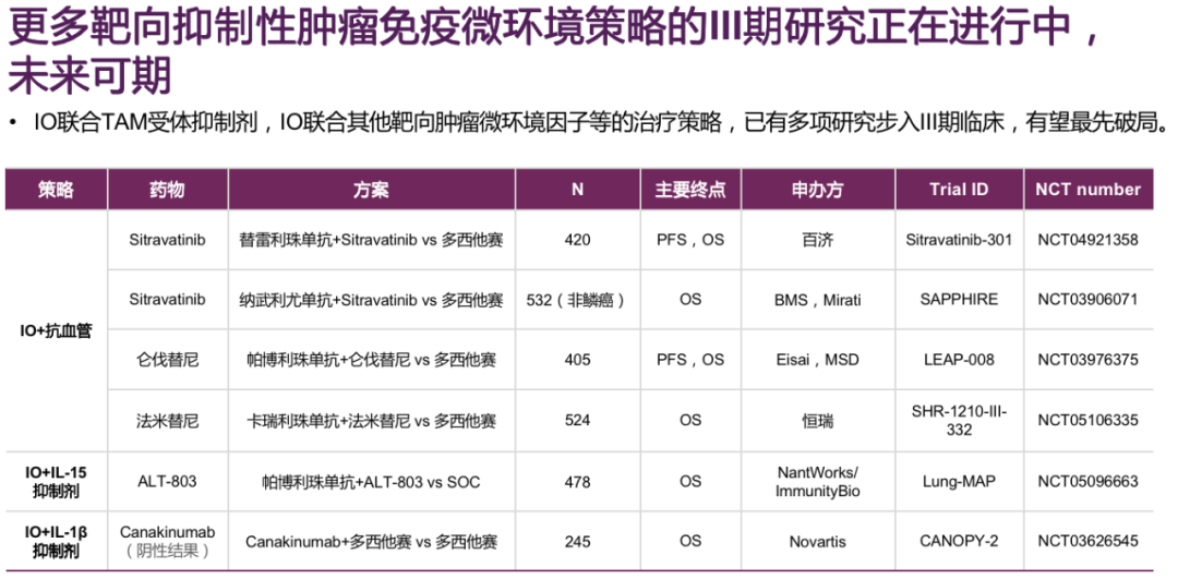 肺癌相关研究有几项在Ⅲ期失败,如IO联合抗血管研究(CANOPY-1、LEAP-007、INTR@PID Lung 037),但IO联合TAM受体抑制剂、IO联合其他靶向肿瘤微环境因子等的治疗策略,已有多项研究步入III期临床,有望最先破局。