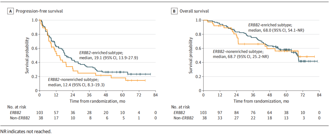 NanoString分析包括通过质量控制的141例乳腺癌样本,69例患者没有样本。正如预期的那样,大多数HER2阳性肿瘤[103(73.0%)]通过PAM50检测为HER2富集亚型。在双重HER2的阻断下,与HER2非富集亚型相比,HER2富集亚型未显示OS增加(图4)。考虑到PFS,HER2富集亚型的结果倾向于略优于HER2非富集亚型(图4)。通过PAM50亚型和治疗组对PFS和OS进行分析,除了在HER2富集亚型的参与者中,B组的表现优于A组。