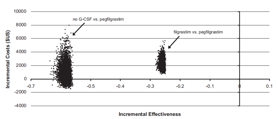 2014, N=1437)。在基线条件下,长效G-CSF组胜过短效G-CSF组和无G-CSF组,长效G-CSF组的预期成本和效益分别为3058美元和12.967QALDs,短效G-CSF组分别为5264美元和12.698QALDs,无G-CSF组的分别为4203美元和12.361QALDs(表1,图2)。这一成本效用分析提供了强有力的证据,证明长效G-CSF不仅具有成本效益,而且在大多数常见的临床和经济环境中节省成本。预防使用长效G-CSF似乎具有临床和经济效益。ASCO指南目前也建议当接受FN风险≥20%的化疗方案治疗时,应该预防性使用长效G-CSF。