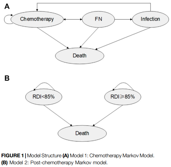 一项中国的真实世界研究[10]评估了PEG-rhG-CSF与rhG-CSF在中国中部地区II-IV期乳腺癌患者中的成本效益。研究者在Excel(Microsoft 2016)中建立了一个数学模型,以估计在两组接受化疗的II、III、IV期乳腺癌女性中,使用PEG-rhG-CSF与rhG-CSF作为一级预防措施的健康益处和成本。研究者生成了两个马尔可夫模型,一个跟踪化疗周期和中性粒细胞减少相关并发症(FN和感染)(模型1),另一个捕获RDI(reduced dose intensity,剂量强度降低)对长期生存的影响(模型2)(图3)。