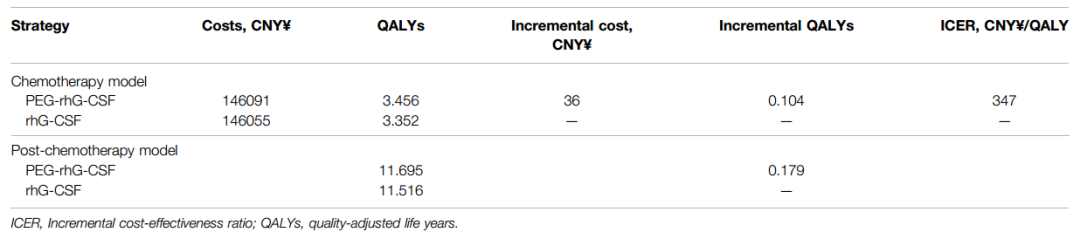 在此项真实世界研究的第一个化疗模型中,与rhG-CSF相比,PEG-rhG-CSF与中性粒细胞减少性发热(FN)(每1000例治疗患者中19例比61例)、感染(每1000例治疗患者中24例比83例)和死亡(每1000例治疗患者中2例比8例)的发生率减少相关,但成本较高(每例治疗患者增加36元)。化疗后模型显示,与rhG-CSF相比,PEG-rhG-CSF可带来更高的质量调整生命年(QALYs) (11.695 vs 11.516)(表2)。