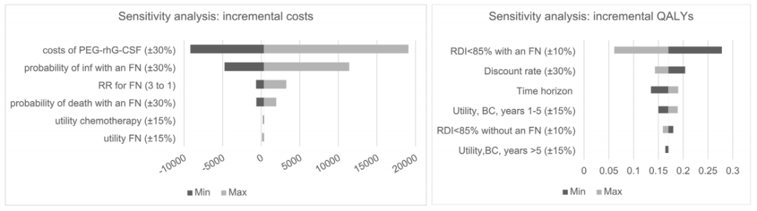 敏感性分析显示,PEG-rhG-CSF成本对增量成本的影响最大,增量QALYs对RDI<85%的风险非常敏感(图4)。与rhG-CSF相比,PEG-rhG-CSF的成本效益概率为66%,支付意愿(WTP)阈值为72,371 元/QALY。根据这项基于真实数据的经济评估,相对于rhG-CSF, PEG-rhG-CSF可能被认为是中国中部II-IV期乳腺癌患者更具成本效益的选择。