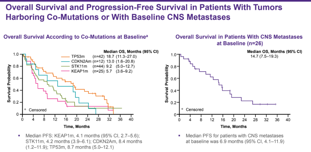 在有共突变和CNS转移的患者中均观察到疗效。基线时有CNS转移患者的中位OS为14.7个月,中位PFS为6.9个月。