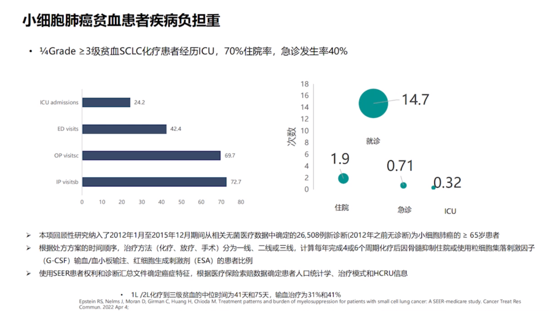对于小细胞肺癌而言,美国一项超过26000例的回顾性分析显示老年SCLC患者贫血发生率达71.7%,由于红细胞寿命相对较长,贫血具有延迟发生的特点,一线化疗中位贫血发生时间在第41天,二线化疗则在第75天,此时患者往往在院外,极其容易忽视。肿瘤相关贫血危害严重,约有40%的患者需要输血治疗,约1/4的≥3度贫血患者会入住ICU,40%的患者赴急诊就诊,70%的患者住院,其紧急性和严重性可见一斑[9]。