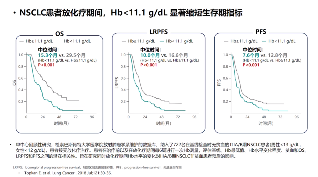肺癌CIA会增加患者死亡风险,降低治疗效果和生活质量,从而患者生存获益。一项入组了10612例肺癌患者的荟萃分析显示,术前贫血患者较非贫血患者的死亡风险提升约1.6倍(HR=1.59)[10]。另一项纳入722例基线无贫血的IIIA/B期NSCLC的研究显示,相较Hb≥11.1g/dL组,Hb<11.1g/d组的总体生存(OS 9.5个月vs 15.3个月)、中位局部无进展生存期(LRPFS 16.6个月vs 10.0个月)、中位无进展生存期(PFS 12.8个月vs 7.2个月)均显著下降,直接影响患者生存[11]。