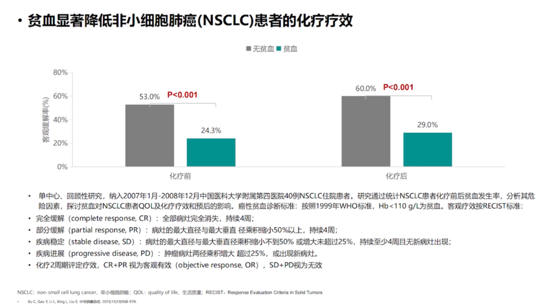 我国同样证实了基线贫血会降低患者生存获益。浙江省肿瘤医院一项回顾了近5000例患者的研究显示,晚期NSCLC患者基线贫血严重程度越高,总生存获益就越差[12]。患者化疗前、化疗后贫血都会降低化疗疗效,降低客观缓解率(ORR)[13]。