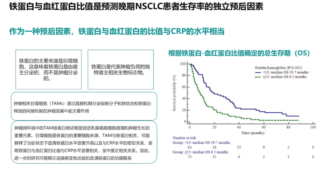 另有研究显示,铁蛋白-血红蛋白比值≥13人群较<13人的OS显著降低(19.7个月vs 8.5个月)。初步分析其原因可能是肿瘤相关巨噬细胞(TAMs)通过直接机制分泌促癌分子和铁蛋白释放的间接机制在肿瘤进展中起主要作用。巨噬细胞是铁蛋白的重要细胞来源,TAM与铁蛋白相关,可能解释了炎症状态下血清铁蛋白水平显著升高以及与CRP水平的密切关系,铁蛋白与血红蛋白比值与CRP水平显著相关,呈中度正相关关系,潜在的揭示了癌变和血清铁蛋白的功能联系。因此,铁蛋白与血红蛋白的比值可作为预测晚期NSCLC的生存率的独立预后因素。