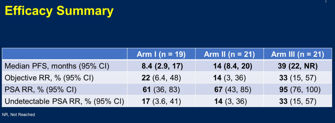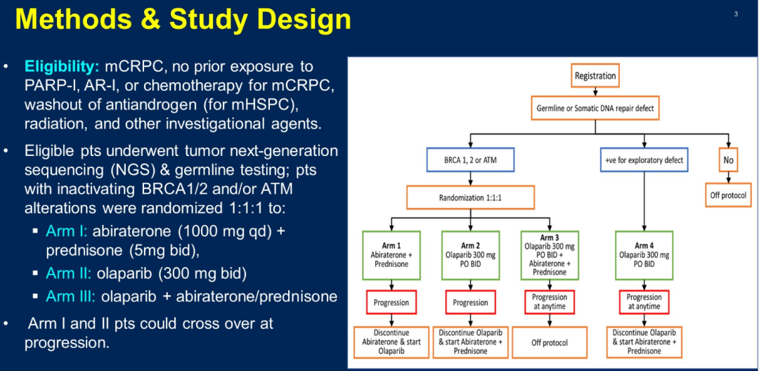 庄君龙教授:BRCAAway研究是一项探讨不同PARPi或NHA一线治疗模式的多队列II期研究,入组患者均为初治的mCRPC(mHSPC阶段没有接受过抗雄治疗),随机分成4个队列,队列1-3是针对BRCA1/2和/或ATM突变的患者:队列1使用阿比特龙(允许进展后交叉使用奥拉帕利);队列2使用奥拉帕利(允许进展后交叉使用阿比特龙);队列3则使用奥拉帕利+阿比特龙;队列4是针对其他非经典的DNA修复缺陷基因患者,使用奥拉帕利+阿比特龙。本次ASCO-GU大会报道队列1-3的结果显示,中位PFS分别为8.4个月、14个月和39个月,PSA缓解率(PSA RR)分别为61%、67%和95%。