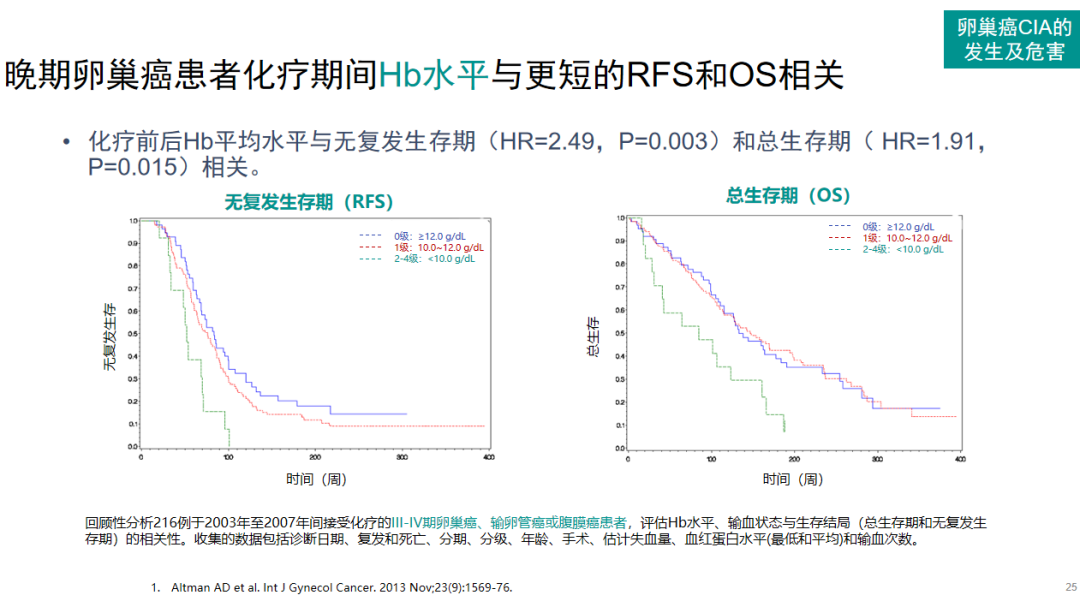 在卵巢癌常用的化疗方案中,紫杉醇、拓扑替康、紫杉醇联合环磷酰胺以及含铂方案的贫血发生率较高,且既往经治的患者更容易发生贫血[15]。贫血的发生对卵巢癌患者的生存存在一定影响,化疗前后Hb平均水平与无复发生存期和总生存期有着相关性,Hb水平越低,卵巢癌患者生存状况越差[16]。但另外一项研究结果则与之相反,在92例上皮性卵巢癌患者中,使用卡铂/紫杉烷为基础的化疗方案后,患者平均Hb水平(Hb>11.2 g/dL)越好,患者的无进展生存时间(PFS)越好,可见Hb水平与PFS具有统计学意义的相关性[17]。