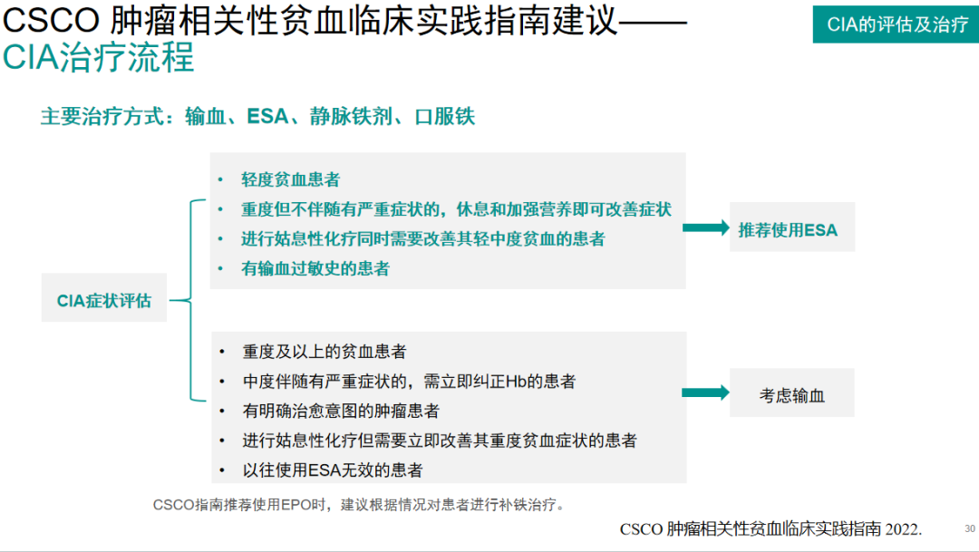 对于不同级别、不同症状的CIA,治疗方式不同、常见的治疗方式包括输血、ESA、静脉补充铁剂、口服铁。根据评估症状,对于轻度贫血者;重度但不伴随有严重症状的、休息和加强营养即可改善症状的;进行姑息性化疗同时需要改善其轻中度贫血的以及有输血过敏史的患者,CSCO指南都推荐使用ESA进行治疗。对于重度及以上的;中度伴随有严重症状的,需立即纠正Hb的;有明确治愈意图的肿瘤患者;进行姑息性化疗但需要立即改善其重度贫血症状以及以往使用ESA无效的患者,CSCO指南推荐考虑输血。此外,若ESA治疗前患者即具有绝对性铁缺乏,则需要先进行补铁,然后再进行ESA治疗[7]。